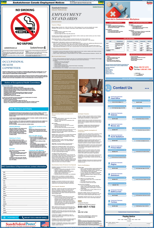 Saskatchewan Canada Employment Notices Poster Includes: Updated with the latest Saskatchewan Employment Act & Regulations Covers: • Payment ...
