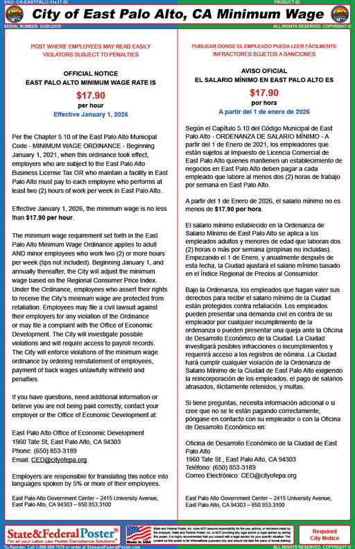 Digital East Palo Alto, California City Labor Law Poster (Bilingual)