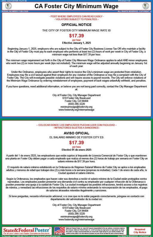 Digital Foster City, California Minimum Wage Poster (Bilingual)