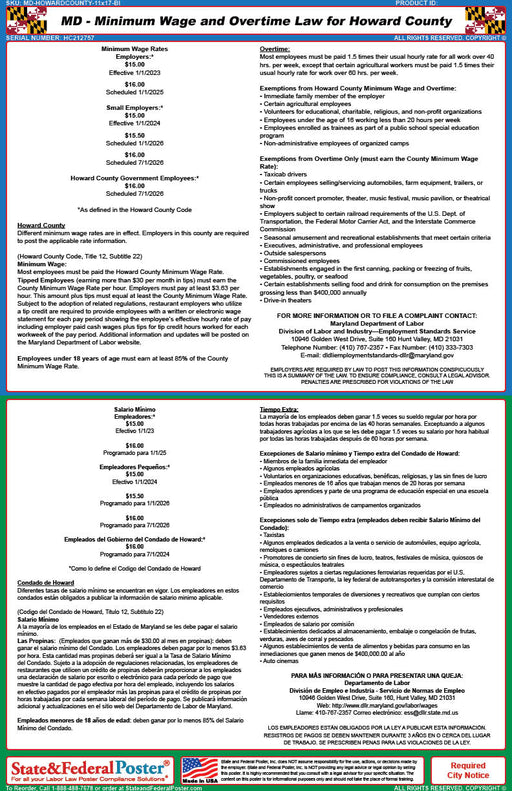 Digital Howard County, Maryland Minimum Wage & Overtime Poster (Bilingual)