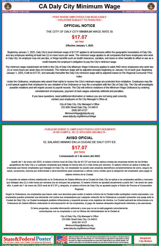 Features Minimum Wage: $18.95 per hour effective January 1, 2026. Bilingual: English and Spanish Poster Size: 11" x 17" Front and back sides are...