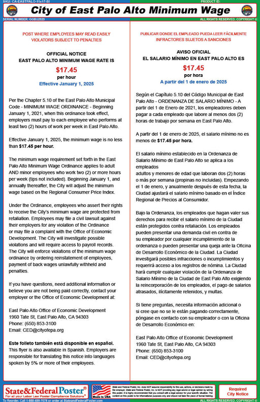 View full detailsBurlingame, California Minimum Wage Poster (Bilingual)