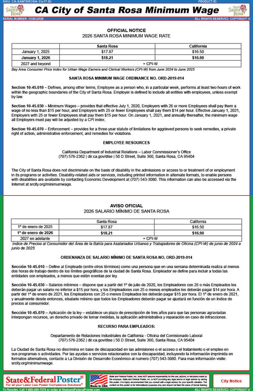 View full detailsSanta Rosa, California Minimum Wage Poster (Bilingual)
