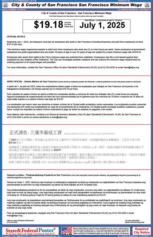On July 1, 2025, the San Francisco minimum wage will increase to $19.18. Features Multilingual: English, Spanish, Chinese, & Tagalog Poster ...