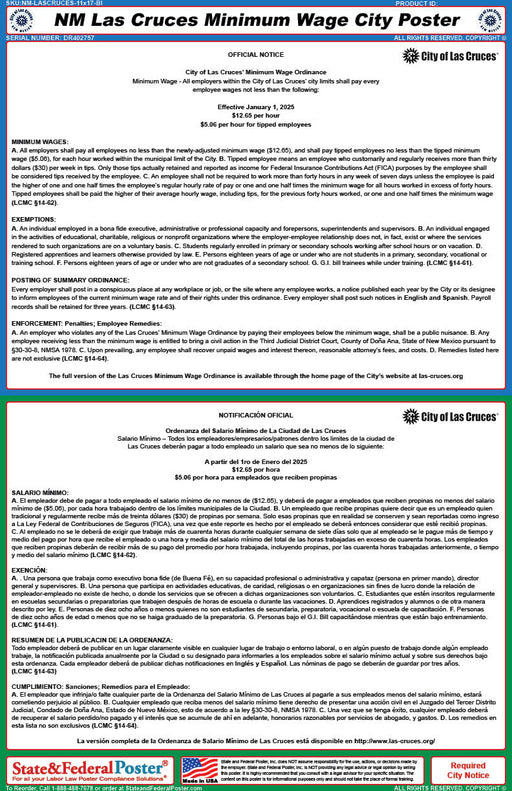 View full detailsLas Cruces, New Mexico Minimum Wage Poster (Bilingual)