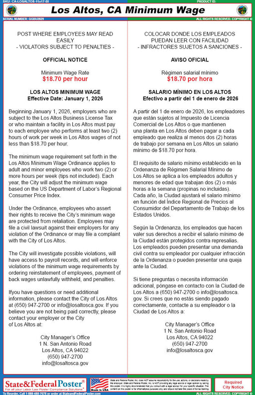Digital Los Altos, California Minimum Wage Poster (Bilingual)