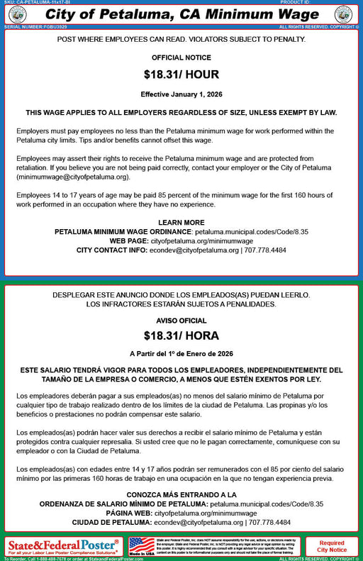 Digital Petaluma, California Minimum Wage Poster (Bilingual)