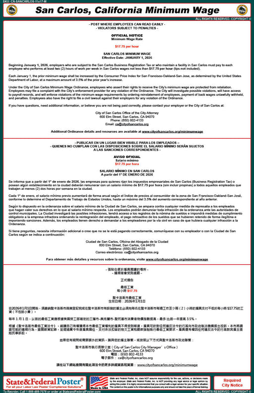 Digital San Carlos, California Minimum Wage Poster (Multilingual)