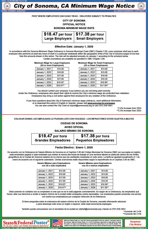 Digital Sonoma, California Minimum Wage Poster (Bilingual)