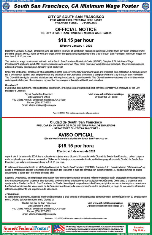 View full detailsSouth San Francisco, California Minimum Wage Poster (Bilingual)
