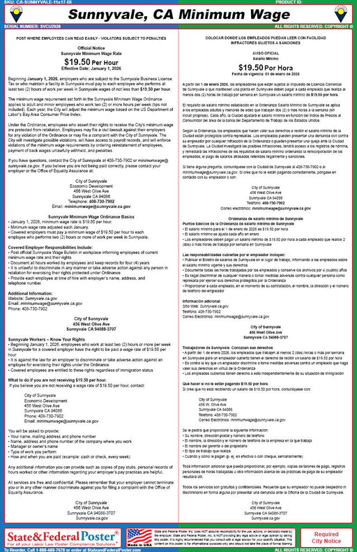 View full detailsSunnyvale, California Minimum Wage Poster (Bilingual)