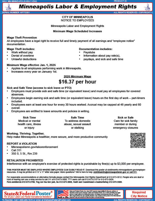 Features Effective January 1, 2026, the Minneapolis minimum wage will be $16.37 per hour Poster Size: 8.5" x 11" Poster is available in Englis...