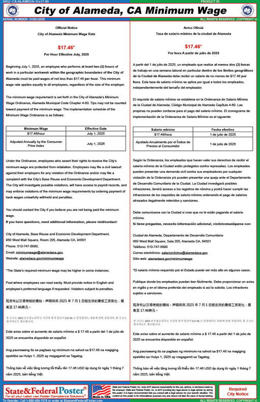 View full detailsAlameda, California Minimum Wage Poster (Bilingual)