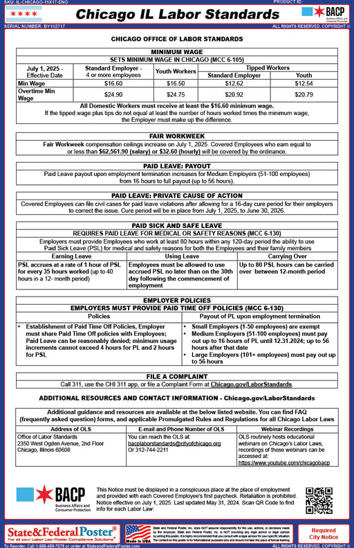 FeaturesThis laminated Chicago Minimum Wage poster has recent labor law postings that meet business requirements to protect employers from posting ...