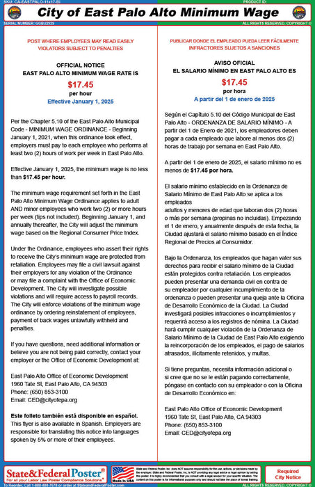 East Palo Alto, California City Labor Law Poster (Bilingual)