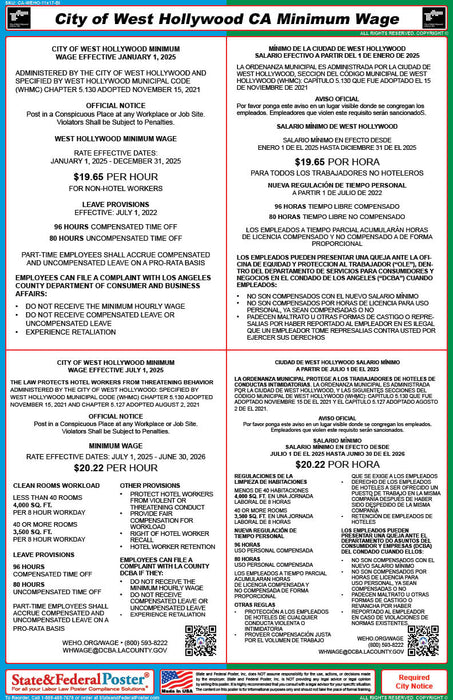 The City of West Hollywood published an Official Minimum Wage Notice that informs employees of the current local minimum wage and their rights. Employers must post the Official Minimum Wage Notice at each workplace or job site in a conspicuous place.